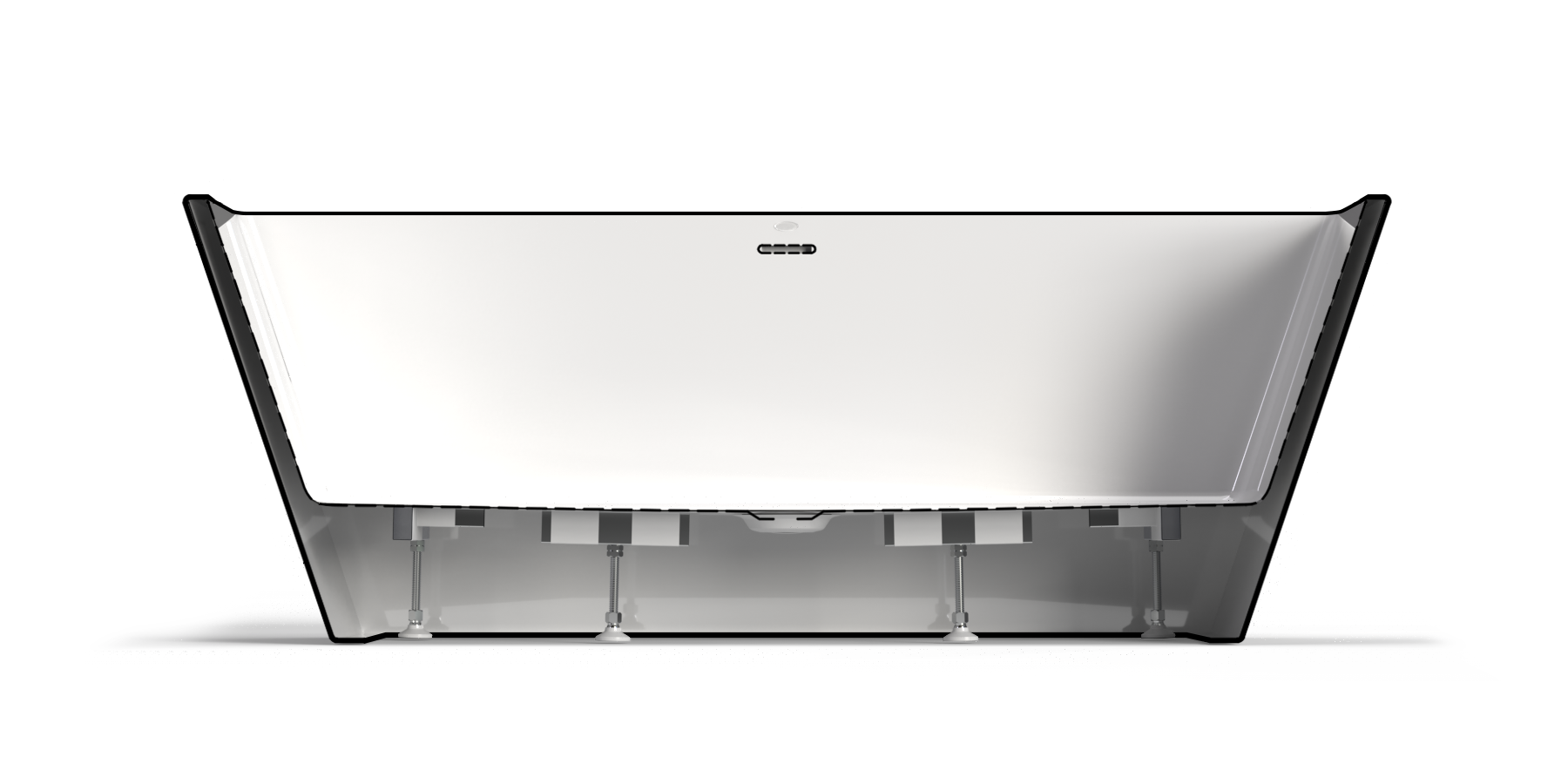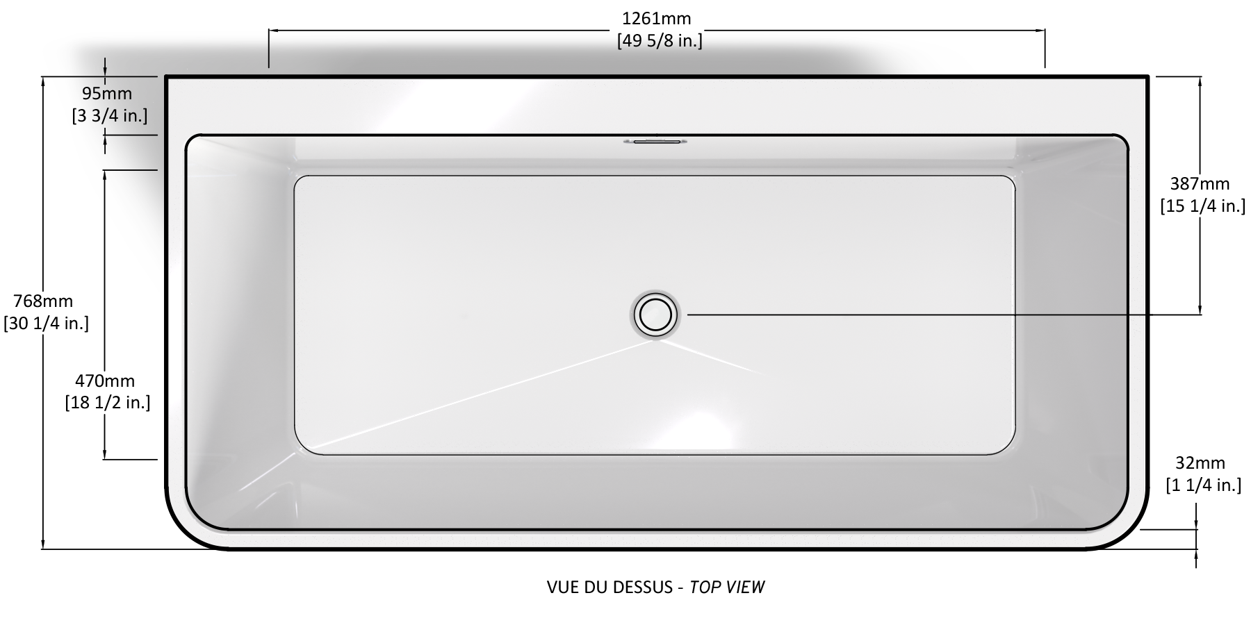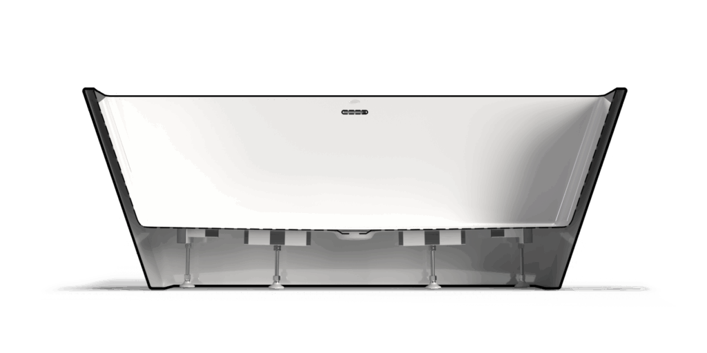 Baignoire autoportante monopièce avec plage de 3,75 po. (95mm) pour installer la robinetterie.