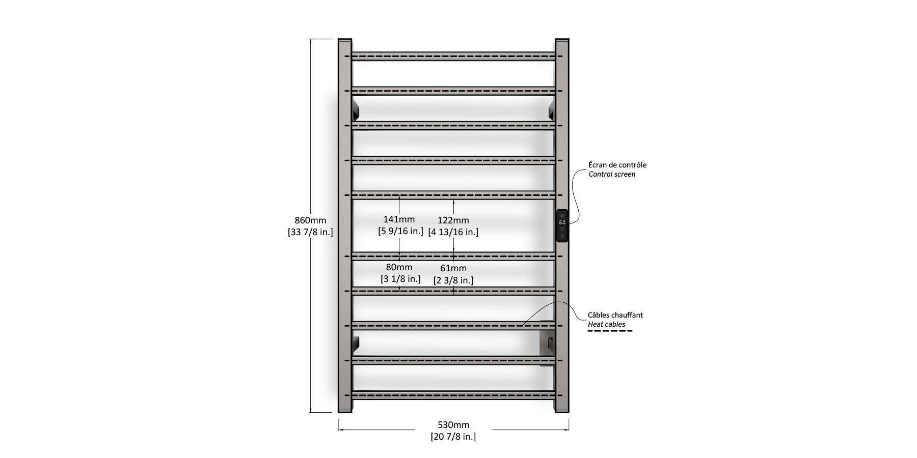Le chauffe-serviettes utilise la technologie du fil chauffant en tungstène à intensité contrôlée. Les fils sont disposés uniformément dans le cadre pour rendre une température régulière sur toute la superficie du chauffe-serviette. Silencieux, il peut chauffer deux à quatre serviettes à la fois.